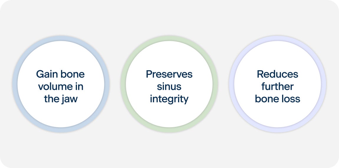 Gain bone volume in the jaw: A certain width and height of bone is necessary to completely cover an implant and allow it to integrate to the bone. Getting the correct dimensions of bone can be accomplished by usually placing bone graft along the edges of the existing jawbone and allowing the native bone and bone graft to grow together. This creates a larger bone to accept the implant.